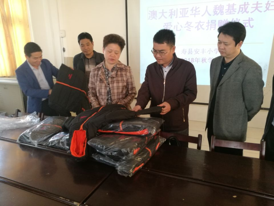 集团公司扶贫帮扶村寿县安丰镇甲贝村是重点贫困村,安丰小学位于安丰镇甲贝村境内,在校学生2025人,贫困学生113人。安丰镇党委政府和集团公司驻村工作队重视侨界资源,积极与市县侨联对接。2018年,在市侨联的关心帮助下,争取到澳大利亚籍华人魏基成夫妇基金会捐赠爱心冬衣192件,价值3万余元。