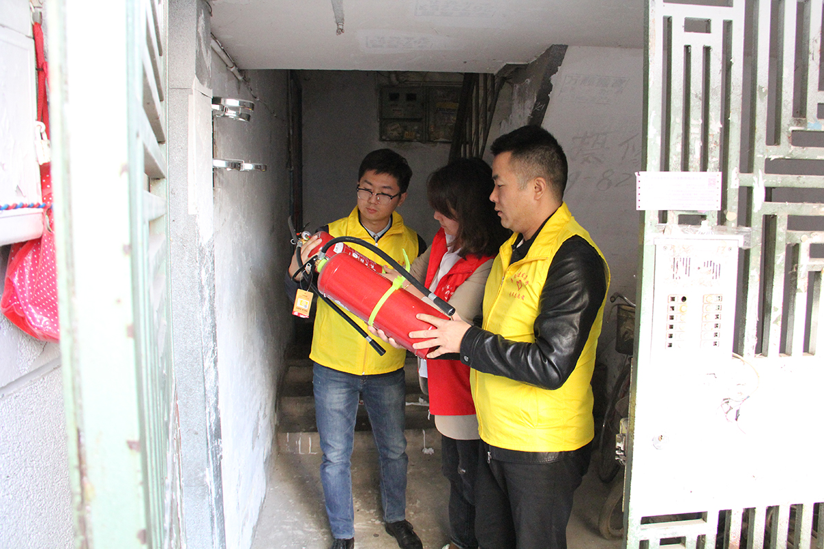 志愿者对小区楼道内的消防器材进行检查