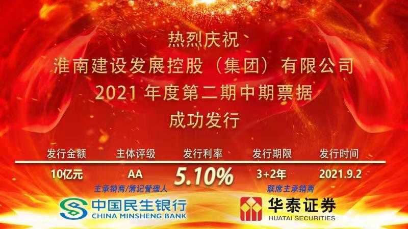 9月2日,建发集团成功发行2021年度第二期中期票据,债券简称:21淮南建发MTN002、发行规模10亿元、票面利率5.1%、期限3+2年。