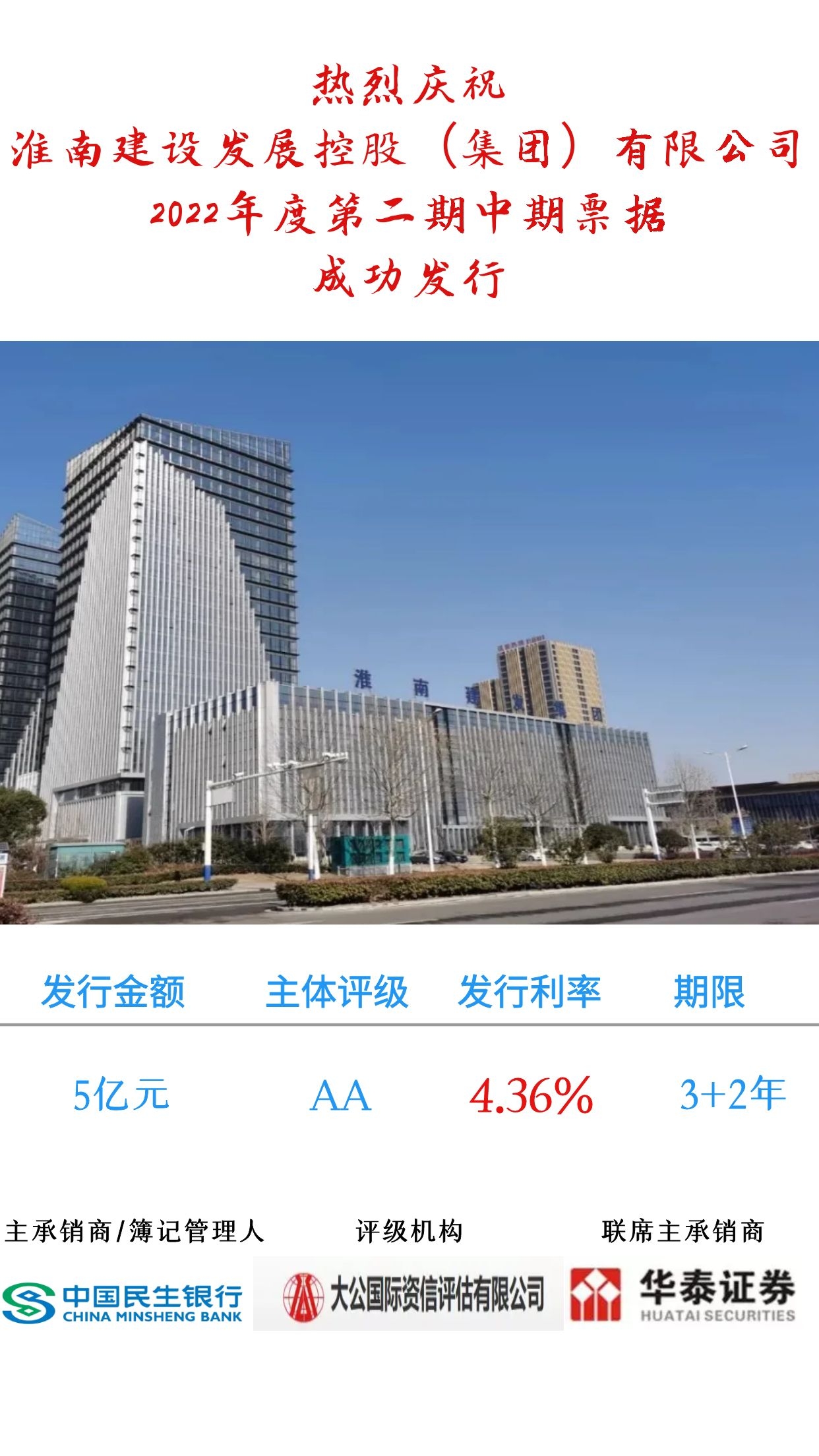 发行要素:22淮南建发MTN002、发行规模5亿元、票面利率4.36%、认购倍数1.8倍。