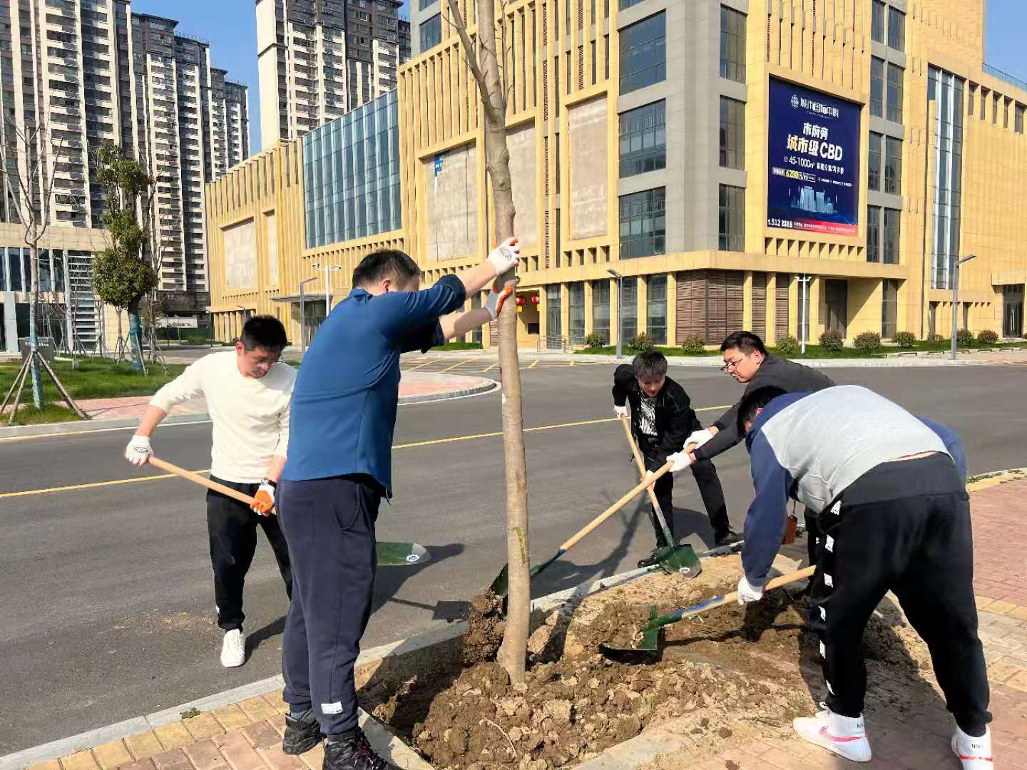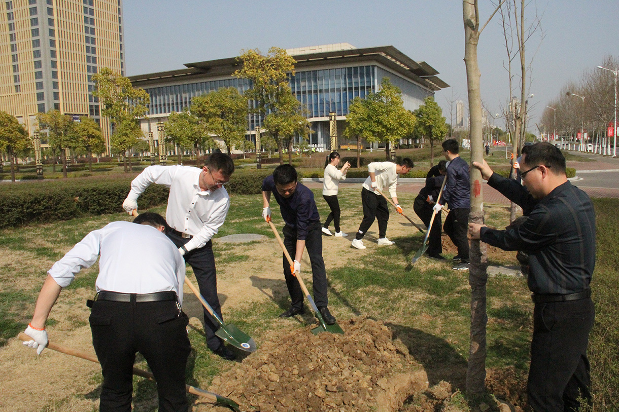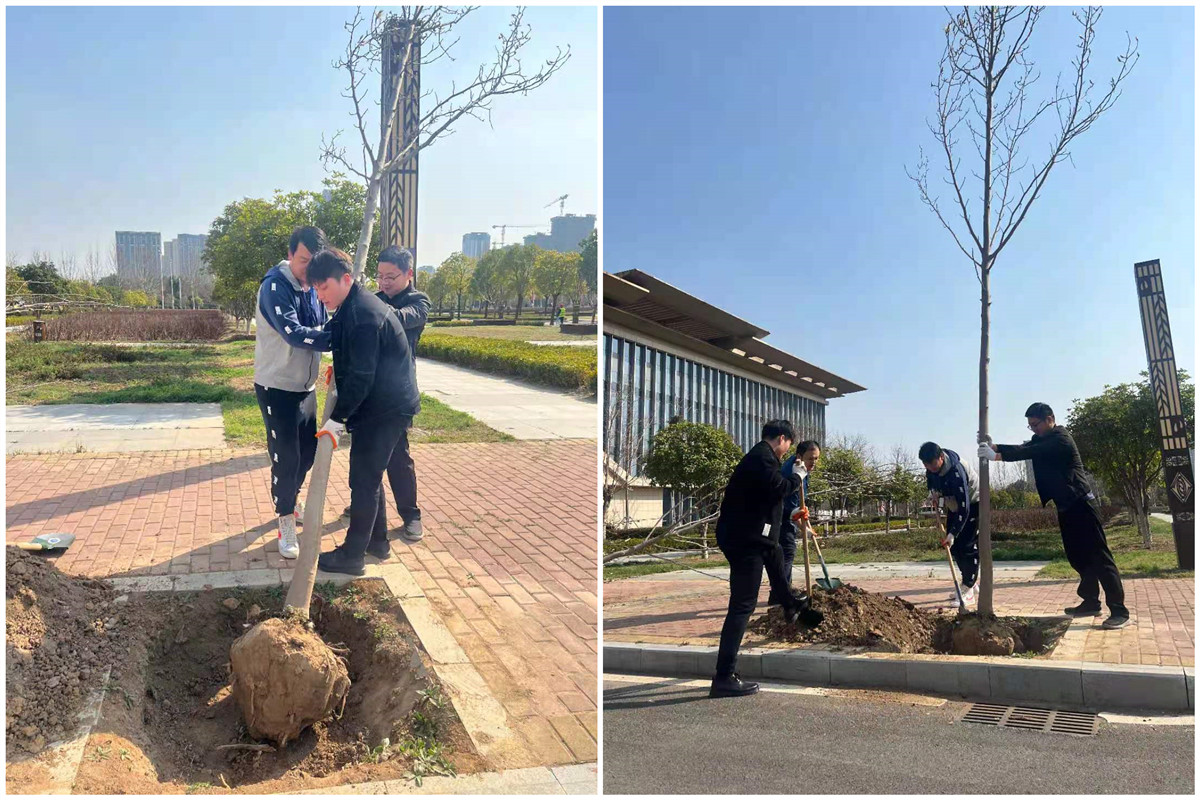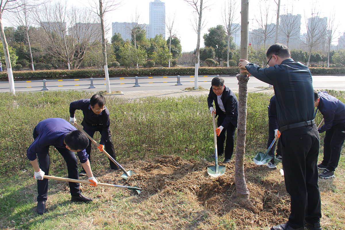 植树节期间,集团公司组织集团干部职工开展树木种植及养护活动。参加人员满怀贡献一份力量,共建绿水青山的活动热情,对树木进行悉心养护。大家分工合作,松土、扶正、固定、浇水,有条不紊、配合默契,活动现场呈现出一片热火朝天的劳动景象。