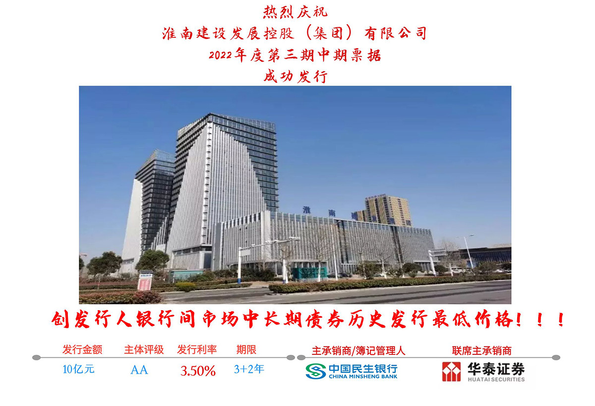 2022年7月21日,sunbet申搏官方网站2022年度第三期中期票据成功簿记发行,发行规模10亿元。本期中期票据主承销商为中国民生银行,联席主承销商为华泰证券,簿记期间获得众多投资者的关注,全场认购倍数2.3倍,最终票面发行利率3.5%,创淮南市市属国有企业中长期债券历史新低。