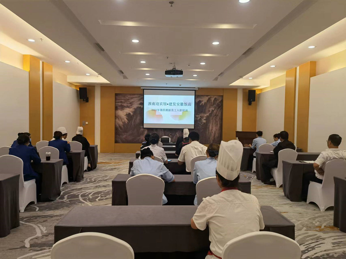 为提升饭店新员工业务素质和技能水平,使新员工综合素质能达到高星级酒店的要求,8月31日,由饭店行政人事部与安保部共同组织进行了2022年第四期新员工集中培训。