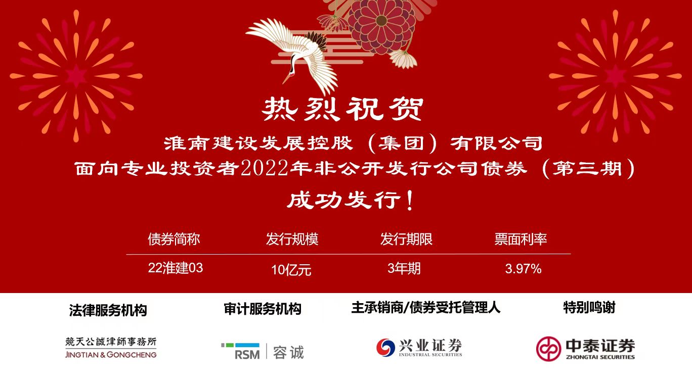 8月30日,建发集团2022年面向专业投资者非公开发行公司债券(第三期)成功发行,债券简称:22淮建03、发行规模10亿元、票面利率3.97%、认购倍数1.29倍,主承销商为兴业证券股份有限公司。