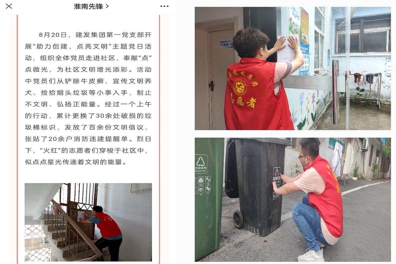 为不断提升党支部组织生活质效,增强基层党组织凝聚力和战斗力,第一党支部坚持把组织生活与企业发展、服务社会、城市治理等紧密结合,以“主题党日”为重要抓手,引导党员在基层一线亮身份、铭初心、担使命,以实际行动践行党的宗旨,充分发挥模范带头作用。8月份组织开展的“助力创建,点亮文明”主题党日活动入选了市委组织部优秀主题党日活动案例,在“淮南先锋”公众号刊登。