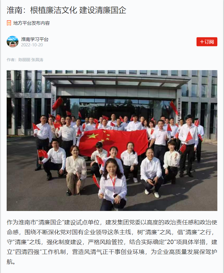 2022年10月,《淮南日报》专版、学习强国刊载了集团公司“清廉国企”建设试点工作情况。