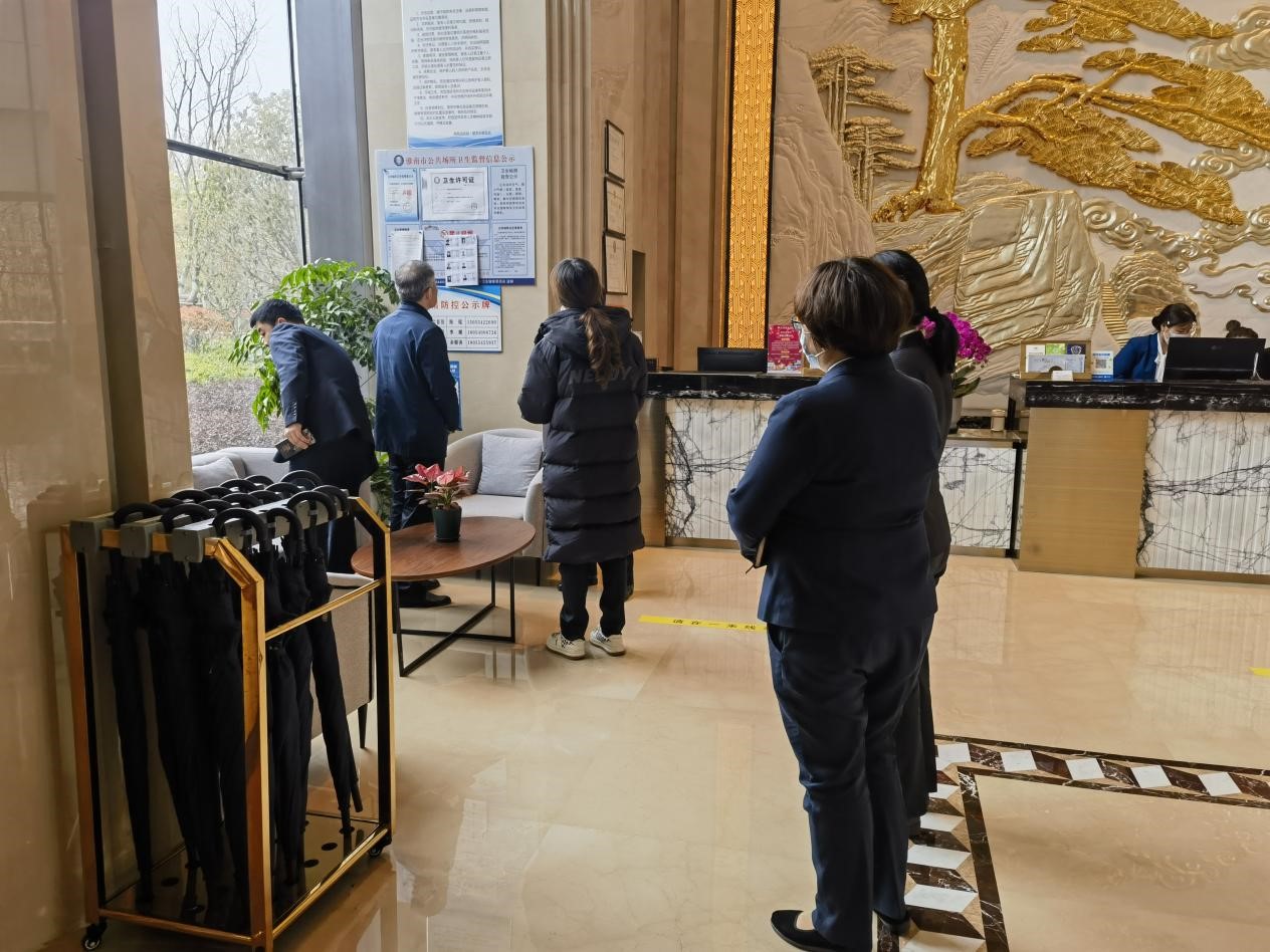 为圆满完成饭店文明创建迎检工作任务,按照文明创建工作实施方案要求,3月24日上午,由酒店管理公司董事长及淮南迎宾馆总经理室成员带队,行政人事部、前厅部、工程部、安保部、客房部、餐饮部、营销部等部门负责人组成的文明创建迎检前卫生综合检查组,对饭店各经营、办公和公共区域等场所的安全、卫生环境情况进行了联合检查。