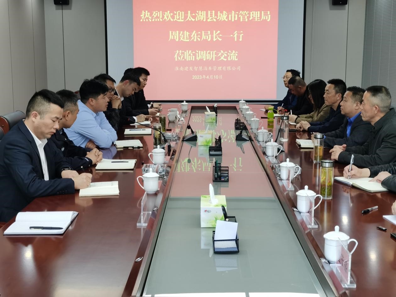 4月10日下午,太湖县城市管理局局长周建东、副局长张勇军等一行到访我司进行调研学习,市住建局李昊、田区交警一大队胡强、建发智泊张辉等进行接待。