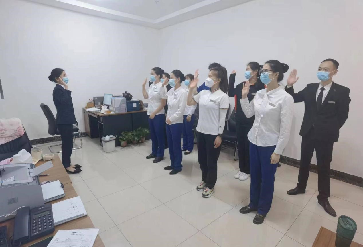 五月份,淮南迎宾馆开展了招手礼培训教育活动,通过在员工打卡处和员工食堂循环播放招手礼仪视频营造学习氛围,行政人事部深入部门班前会现场授课教学,部门督促员工将招手礼仪运用在对客服务之中,每日质检全员落实情况。