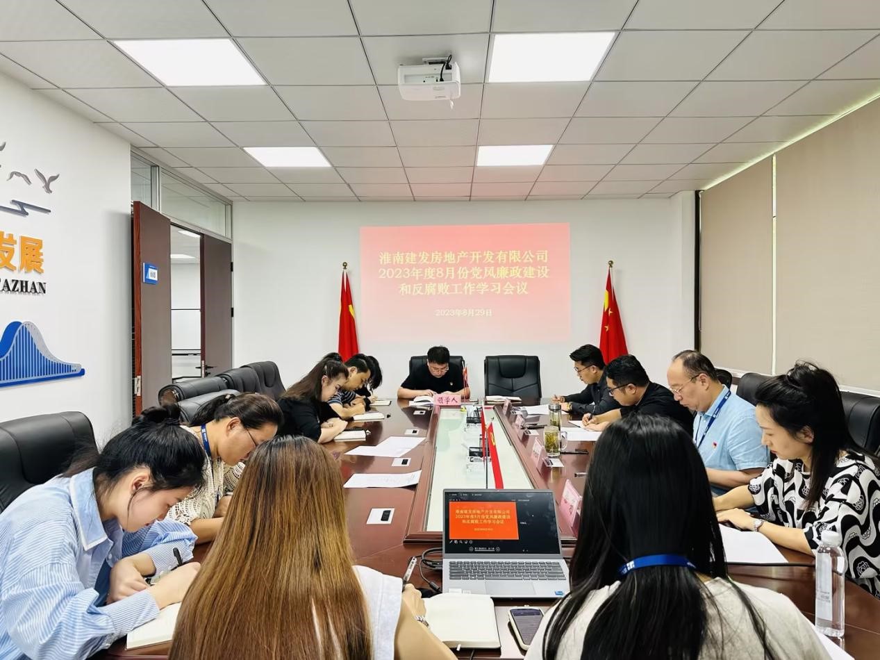 为增强廉洁自律意识,持之以恒正风肃纪,促进公司党风sunbet中国官网和反腐败工作进一步压紧压实,助推公司高质量发展,8月29日下午,淮南建发房地产开发有限公司在公司2楼会议室召开2023年度8月份党风sunbet中国官网和反腐败工作学习会议,公司全体员工参加。