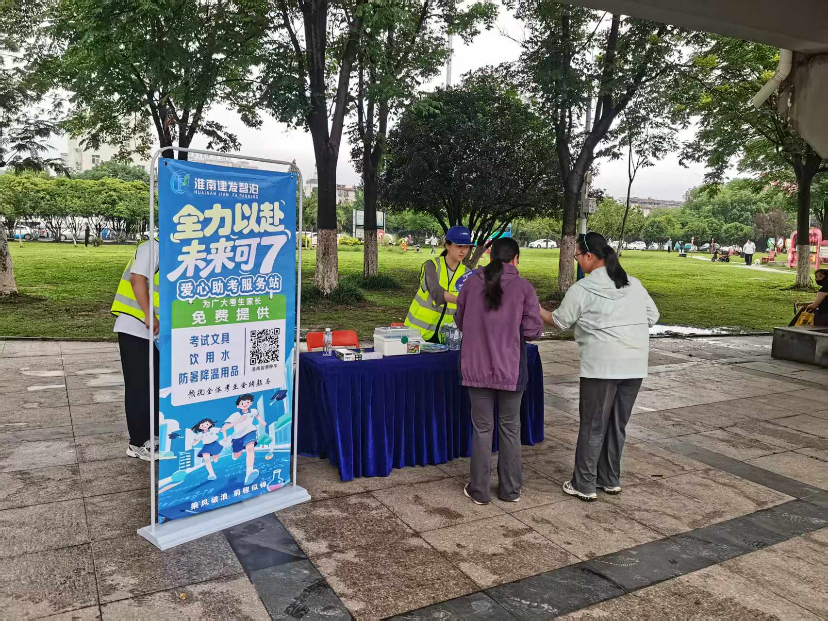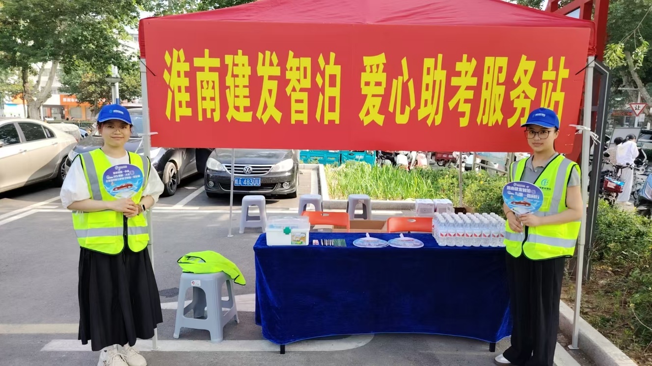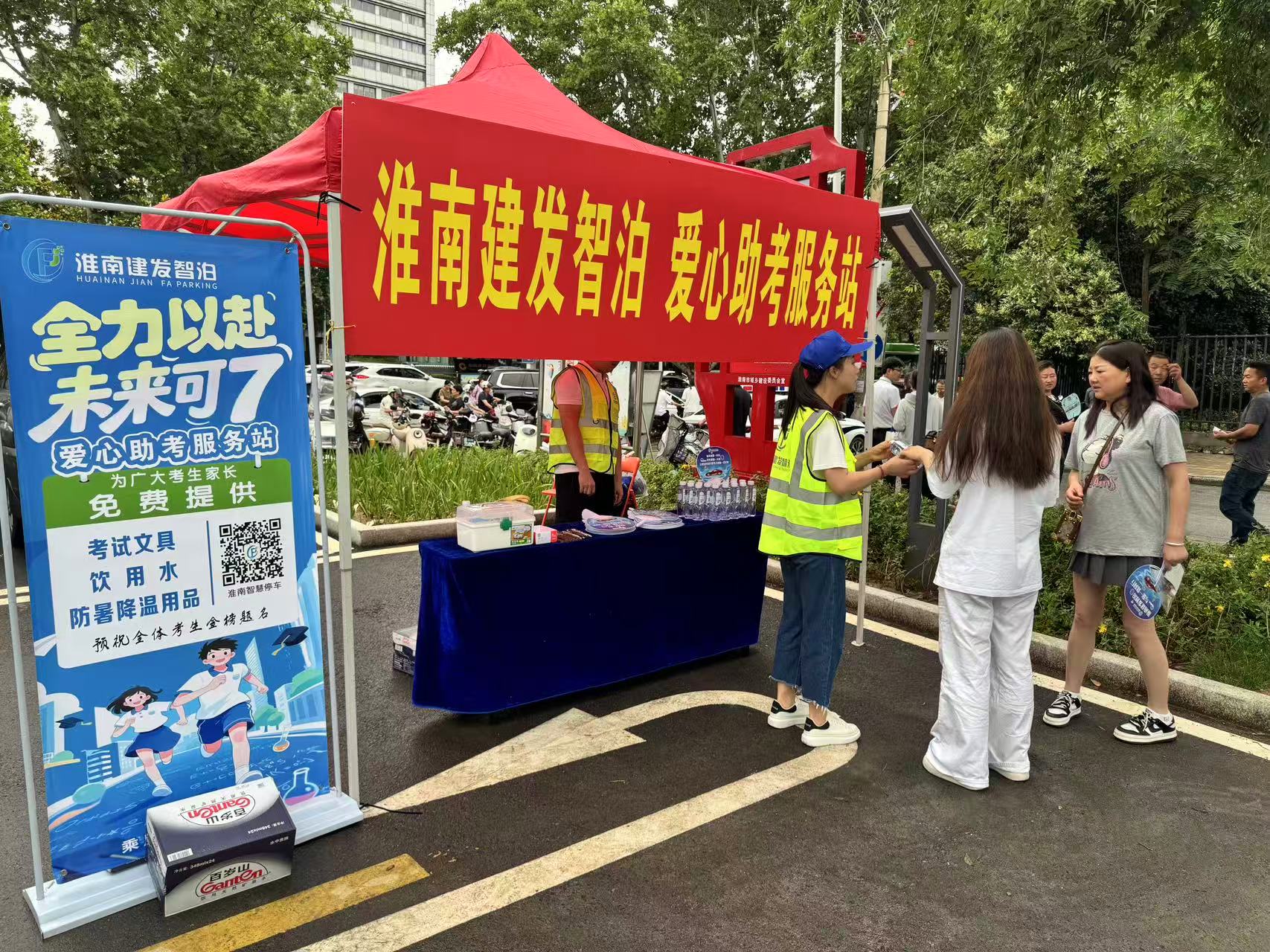 中高考期间周末,为服务考生及家长,营造温馨、便利的应考环境,淮南建发智慧泊车管理有限公司积极履行社会责任,在淮南市第一中学及实验中学考点周边两处重点停车场内,精心设立了“爱心助考服务站”。